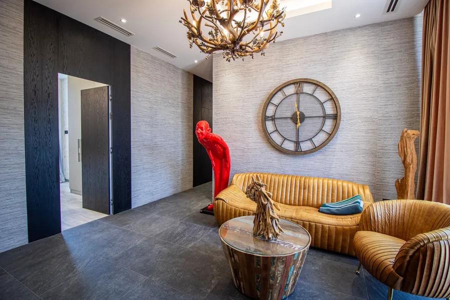 • Sophisticated interior design featuring custom finishes, high ceilings, designer chandeliers, and an artfully curated living space