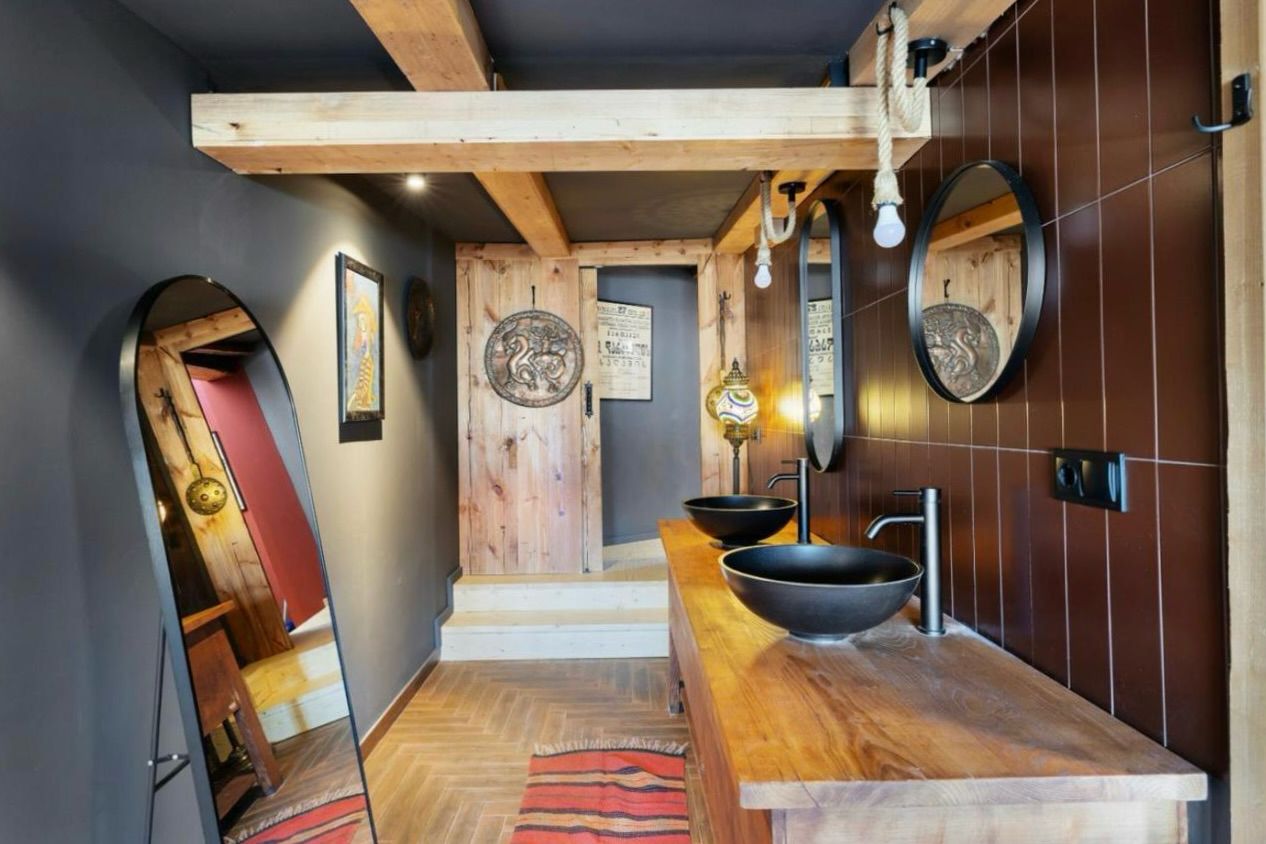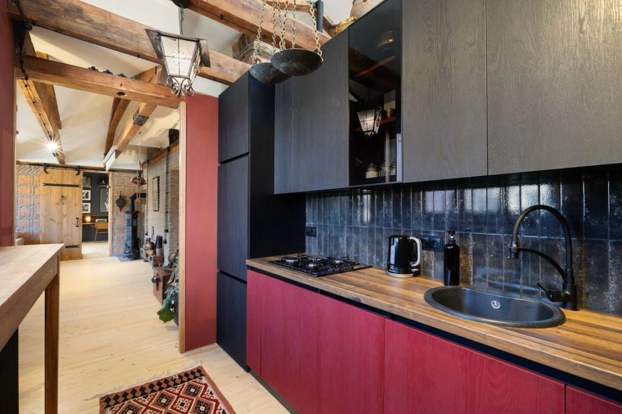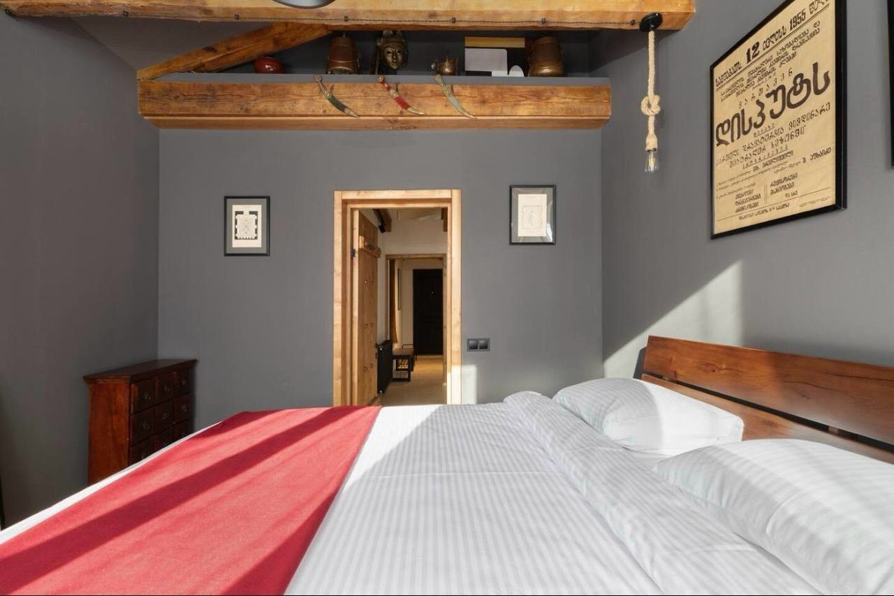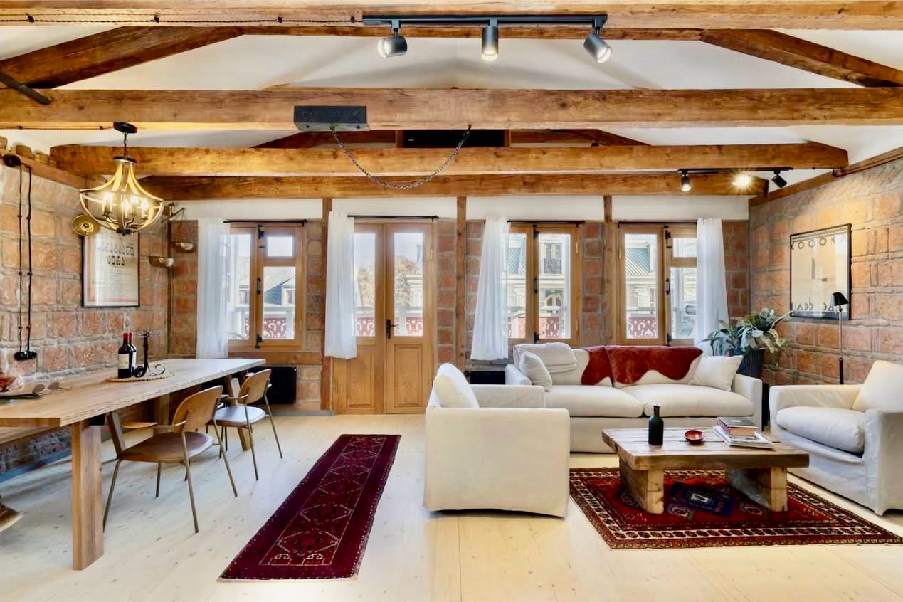 This 106 m² top-floor residence sits directly on David Aghmashenebeli Avenue and has been fully renovated while preserving its original Georgian architecture — exposed brick, restored timber beams, natural wood textures, and authentic historic details.