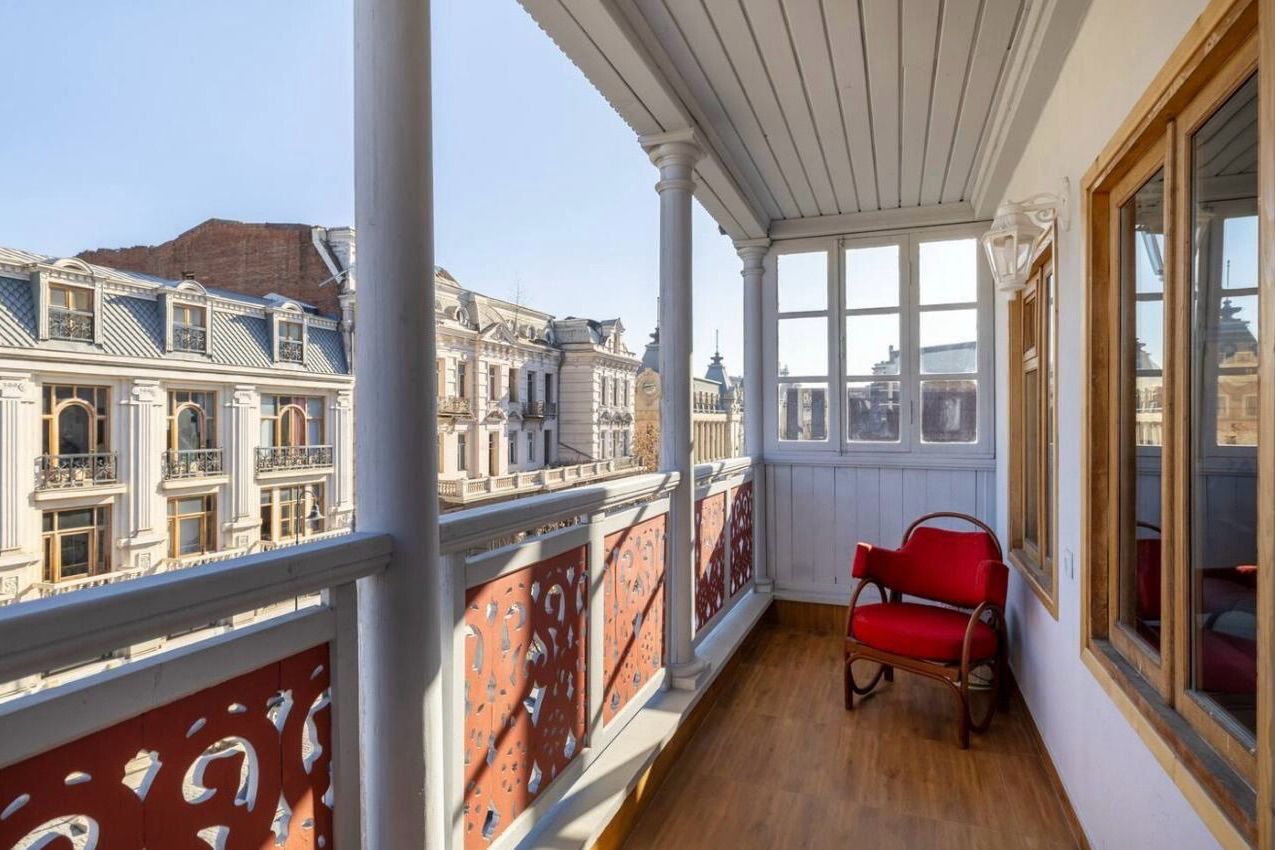 Morning light hits the balcony overlooking the historic façades of Aghmashenebeli — an authentic old-Tbilisi atmosphere without sacrificing comfort.